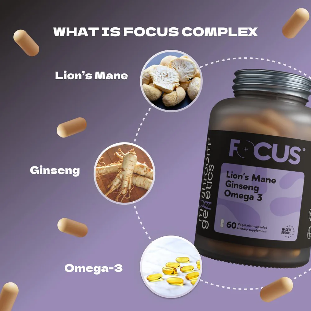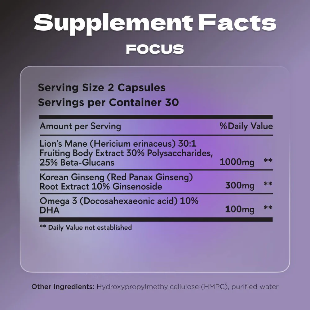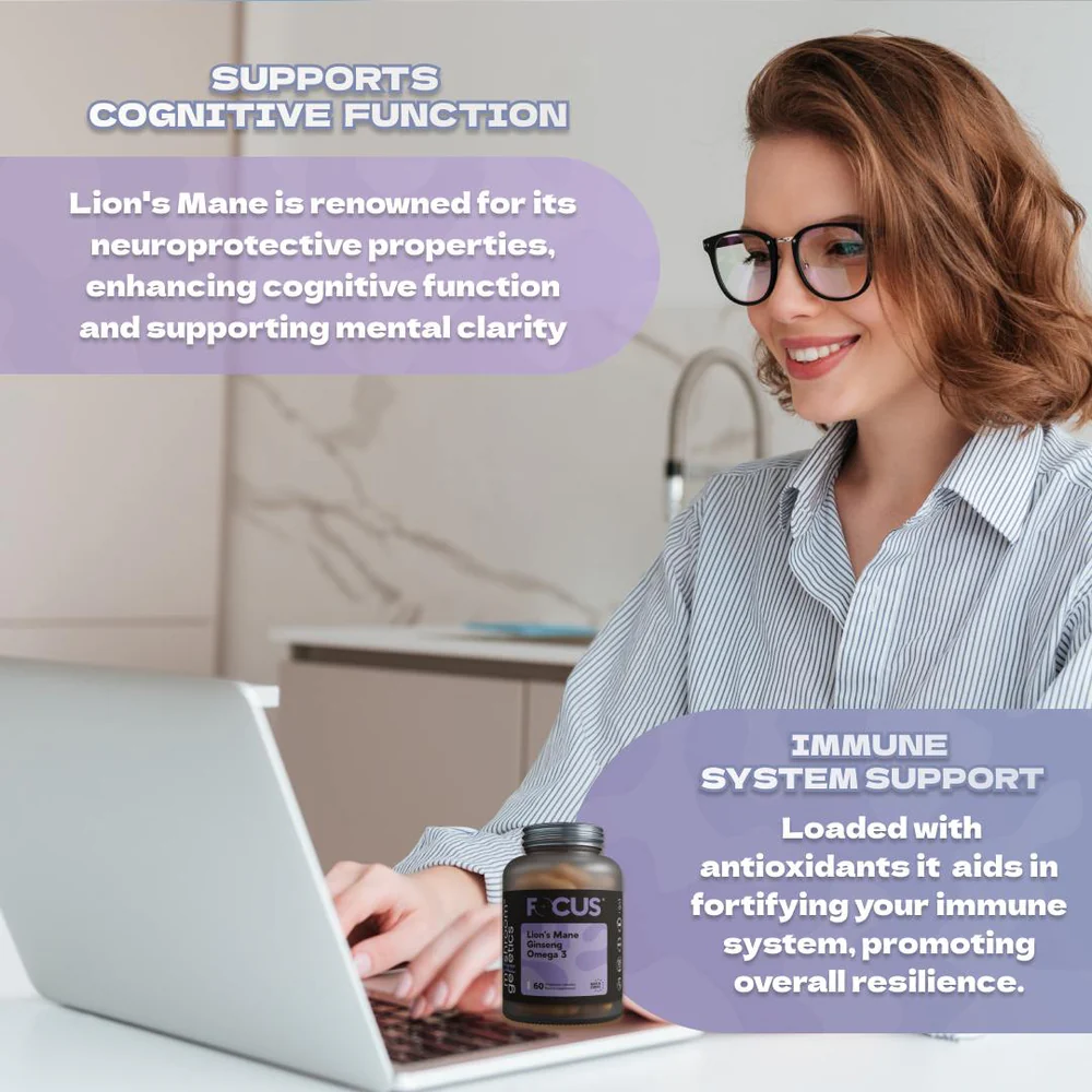 Unlock Mental Clarity & Peak Performance with Focus Complex Stay sharp and energized with Focus Complex, a premium blend of Lion’s Mane Mushroom, Korean Ginseng, and Omega-3 DHA—scientifically formulated to enhance cognitive function, improve focus, and support brain health.